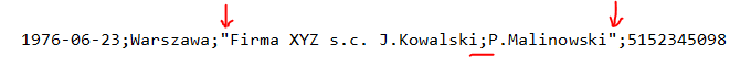 Należy pamietać, że jeśli w danych występuje znak separatora, to należy je objąć cudzysłowem, jak w poniższym przykładzie, gdzie nazwa firmy została zamknieta w cydzysłów, gdyż zawierała średnik bedący znakiem rozdzielającym: